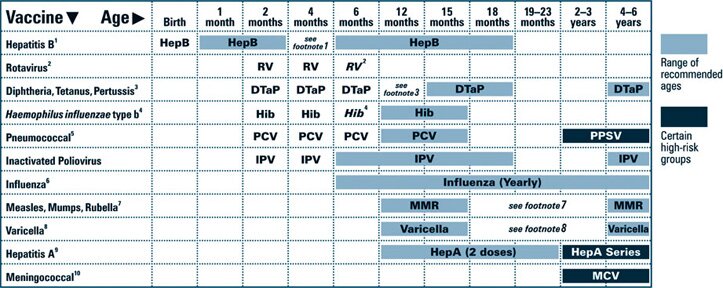 This schedule indicates the recommended ages for routine administration of currently licensed vaccines, as of December 1, 2008, for children aged 0 through 6 years. Any dose not administered at the recommended age should be administered at a subsequent visit, when indicated and feasible. Licensed combination vaccines may be used whenever any component of the combination is indicated and other components are not contraindicated and if approved by the Food and Drug Administration for that dose of the series. Providers should consult the relevant Advisory Committee on Immunization Practices statement for detailed recommendations, including high-risk conditions: http://www.cdc.gov/vaccines/pubs/acip-list.htm. Clinically significant adverse events that follow immunization should be reported to the Vaccine Adverse Event Reporting System (VAERS). Guidance about how to obtain and complete a VAERS form is available at http://www.vaers.hhs.gov or by telephone, 800-822-7967.